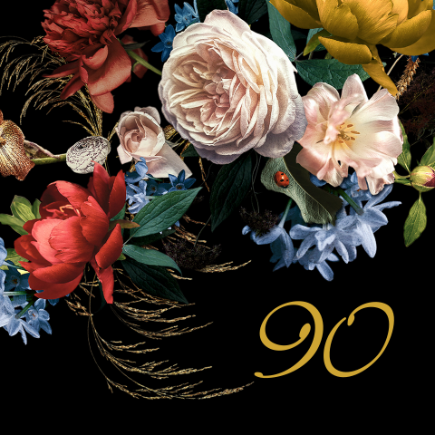 Verjaardagsuitnodiging 90 jaar met bloemen en goudfolie druk